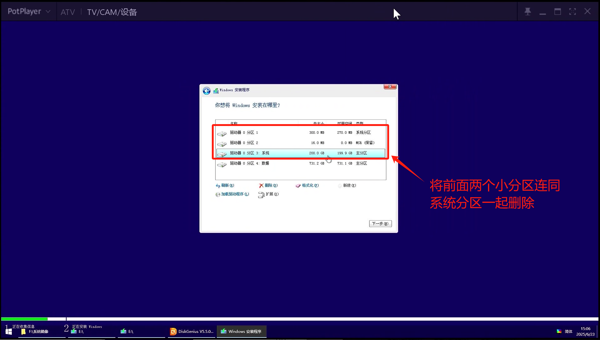 在将系统安装到系统盘符的时候,可以通过删除前面的小分区(大约几十兆到一百多兆大小)和系统分区(安装系统的分区)来提高操作系统安装的成功率: