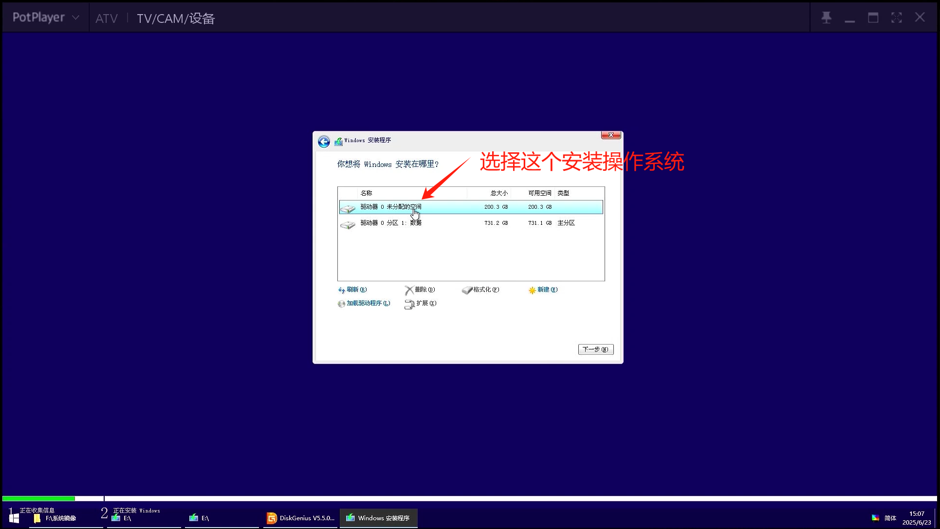 删除后的界面如下图,然后我们选择驱动器 0 未分配的空间来安装操作系统:
