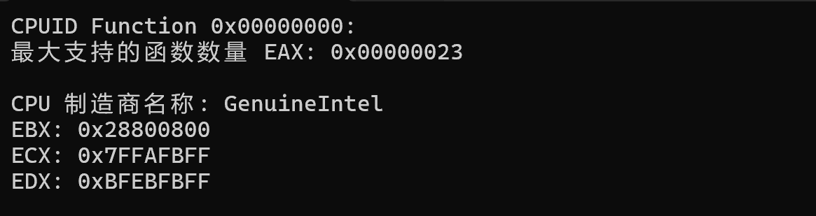 printf("最大支持的函数数量 EAX: 0x%08X\n\n", eax);