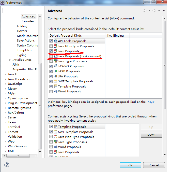 Window->Preferences->Java->Editor->Content Assit->Advanced