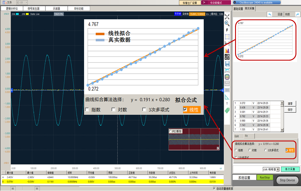 在示波器软件上查看波形,并使用主界面上方工具栏“示波器”选项中的单次采集功能,对转换后的电信号进行数据采集,并连点成线绘制折线图;在数据分析界面勾选线性拟合选项,系统将自动对数据序列进行回归拟合,生成包含斜率、截距等参数的拟合趋势线及对应的数学表达式 y=kx+b。