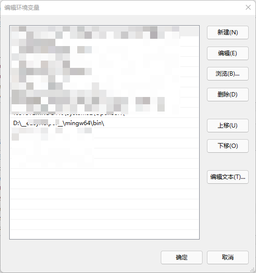 在这里只需新建一个就行,并把之前的MinGW的安装路径粘贴过来就行,注意路径最后一定是\bin\,不能更改。一次点击确定就算完成了。重复步骤三,就会出现你安装的MinGW的版本等其他一系列信息。