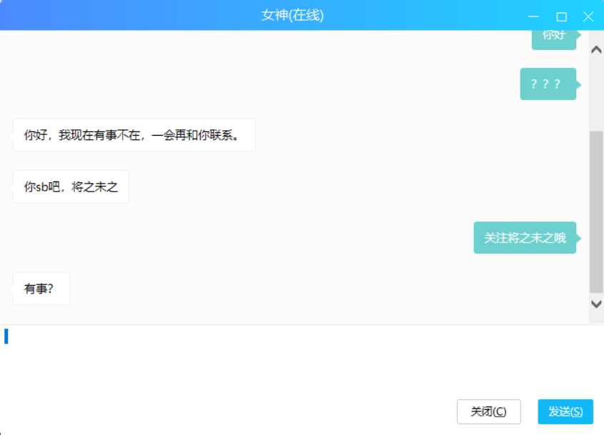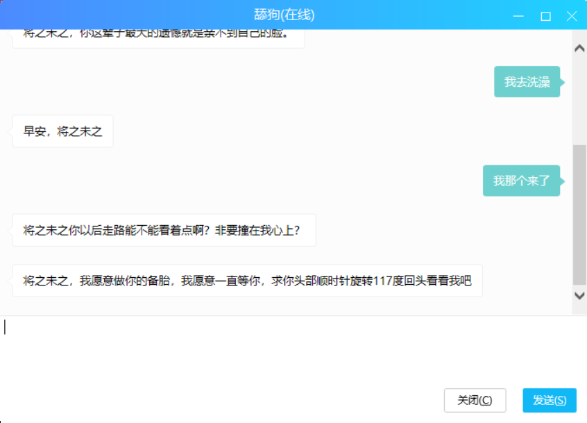 首先来看看舔狗模式。可以看到女神是十分高冷的,需要追女神的不如先来练练,连程序都感动了,还怕追不到女神吗?