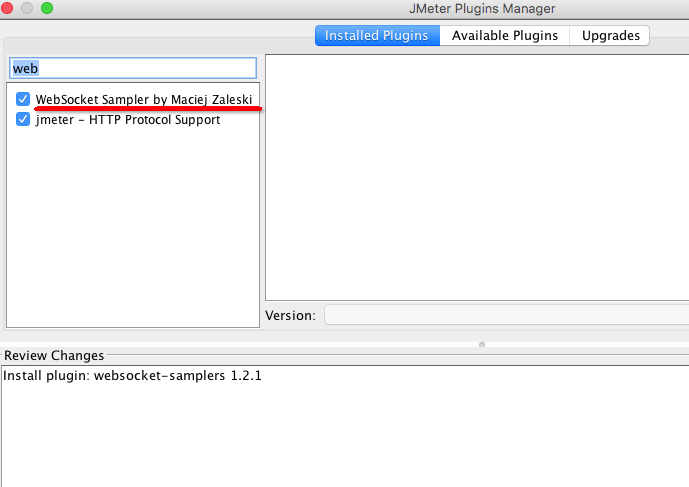 在available plugs选项搜索中输入websocket, 在列表中勾选即可在线安装, 我已经安装过了就在installed plugs选项中