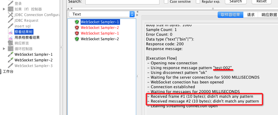 websocket sample-1的运行结果就是didn't match any pattern, Response Pattern若为空不填,代表什么都匹配.