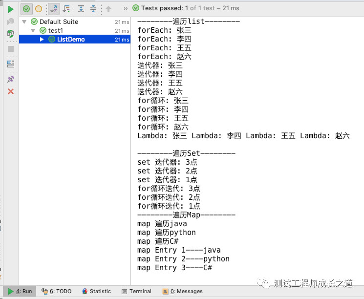 package utl; import org.testng.annotations.Test; import java.util.Map.Entry; import java.util.*; public class ListDemo { @Test public void testList(){ System.out.println("--------遍历list--------"); //遍历List List list=new ArrayList(); list.add("张三"); list.add("李四"); list.add("王五"); list.add("赵六"); //foreach 循环, 遍历数字列表 for(Object str : list ){ System.out.println("forEach: "+ str); } //通过Iterator 迭代器遍历 Iterator it=list.iterator(); while (it.hasNext()){ String str=(String) it.next(); System.out.println("迭代器: "+str); } // for循环 ArrayList 查询速度是比较快的, 条件是size for(int i=0;i<list.size();i++){ System.out.println("for循环: "+list.get(i)); } //Lambda list.forEach(str->{ System.out.print("Lambda: "+str +" "); }); System.out.println("\n"); System.out.println("--------遍历Set--------"); //遍历set Set set= new HashSet(); set.add("1点"); set.add("2点"); set.add("3点"); //方式一 迭代器 while循环 Iterator i= set.iterator(); while(i.hasNext()){ System.out.println("set 迭代器: "+i.next()); }