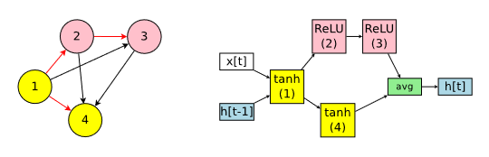 不难发现,左图如果算上红黑线,其表示的有向图的基本图是一个无向完全图。也就是说这个搜索空间是这样构建的:先规定需要N个节点,然后给节点标上序号1~N,序号1接收x[t]和h[t-1],后面的序号有机会接收所有序号比它小的节点的输出,因此对这些节点进行两两连线,并按照序号大小决定箭头方向,序号小的为箭尾,序号大的为箭头。
