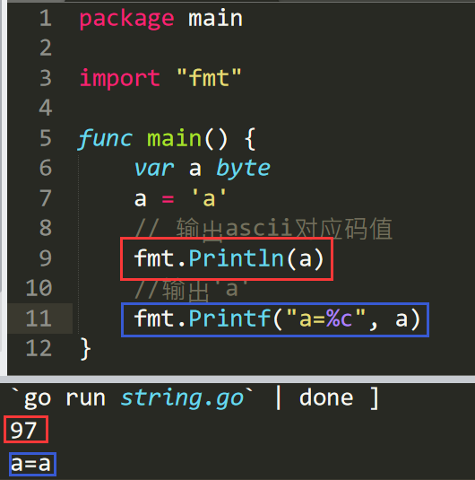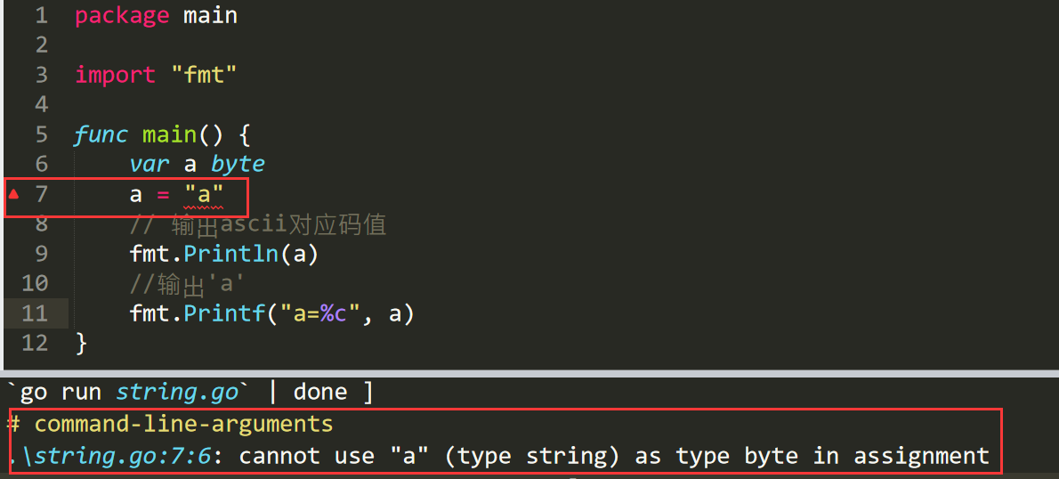 ①:字符常量只能使用单引号括起来,例如:var a byte = 'a' var a int = 'a'