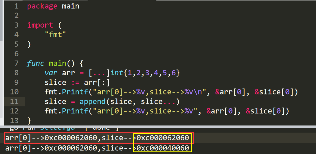 备注:append()函数如果最佳的是具体的数值如slice = append(slice, 10)则不需要...;由下图可知append后,slice引用了新的内存数组地址。