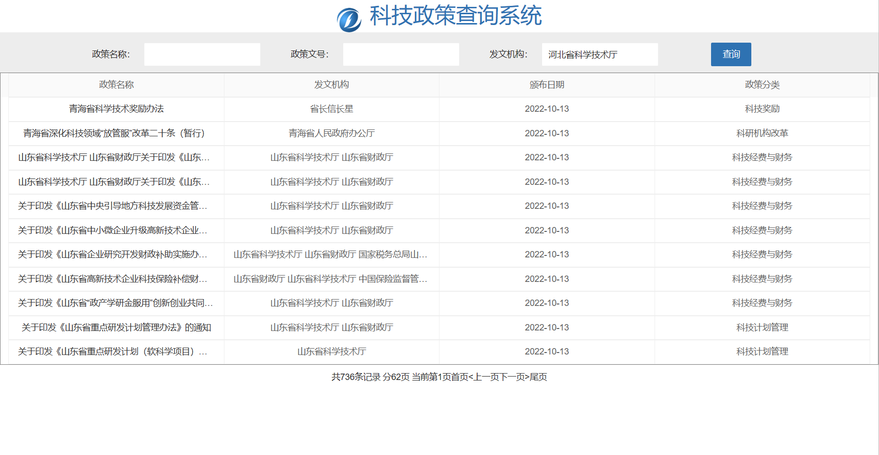 <%@ page language= "java" contentType= "text/html; charset=UTF-8"%> <!DOCTYPE html PUBLIC "-//W3C//DTD XHTML 1.0 Transitional//EN" "http://www.w3.org/TR/xhtml1/DTD/xhtml1-transitional.dtd"> <html xmlns="http://www.w3.org/1999/xhtml" lang="en" xmlns:th="http://www.thymeleaf.org"> <head> <meta http-equiv="Content-Type" content="text/html; charset=utf-8" /> <%@ page import="java.sql.*"%> <title>www.jb51.net JS分页</title> <style type=""> td{ max-width: 320px; white-space: nowrap; overflow: hidden; text-overflow: ellipsis; }</style> <script> /** * 分页函数 * pno--页数 * psize--每页显示记录数 * 分页部分是从真实数据行开始,因而存在加减某个常数,以确定真正的记录数 * 纯js分页实质是数据行全部加载,通过是否显示属性完成分页功能 **/ function goPage(pno,psize){ var itable = document.getElementById("idData"); var num = itable.rows.length;//表格所有行数(所有记录数) console.log(num); var totalPage = 0;//总页数 var pageSize = 12;//每页显示行数 //总共分几页 if(num/pageSize > parseInt(num/pageSize)){ totalPage=parseInt(num/pageSize)+1; }else{ totalPage=parseInt(num/pageSize); } var currentPage = pno;//当前页数 var startRow = (currentPage - 1) * pageSize+1;//开始显示的行 31 var endRow = currentPage * pageSize;//结束显示的行 40 endRow = (endRow > num)? num : endRow; //40 console.log(endRow); //遍历显示数据实现分页 for(var i=1;i<(num+1);i++){ var irow = itable.rows[i-1]; if(i>=startRow && i<=endRow){ irow.style.display = "block"; }else{ irow.style.display = "none"; } } var tempStr = "共"+num+"条记录 分"+totalPage+"页 当前第"+currentPage+"页"; if(currentPage>1){ tempStr += "<a href=\"#\" onClick=\"goPage("+(1)+","+psize+")\">首页</a>"; tempStr += "<a href=\"#\" onClick=\"goPage("+(currentPage-1)+","+psize+")\"><上一页</a>" }else{ tempStr += "首页"; tempStr += "<上一页"; } if(currentPage<totalPage){ tempStr += "<a href=\"#\" onClick=\"goPage("+(currentPage+1)+","+psize+")\">下一页></a>"; tempStr += "<a href=\"#\" onClick=\"goPage("+(totalPage)+","+psize+")\">尾页</a>"; }else{ tempStr += "下一页>"; tempStr += "尾页"; } document.getElementById("barcon").innerHTML = tempStr; } </script> <script th:src="@{/layuimini/js/lay-module/echarts/echarts.js}"></script> <script th:src="@{/layuimini/js/lay-module/echarts/wordcloud.js}"></script> <link rel="stylesheet" type="text/css" href="https://www.layuicdn.com/layui/css/layui.css" /> <script src="https://www.layuicdn.com/layui/layui.js"></script> </head> <body onLoad="goPage(1,10);"> <div style="text-align:center;"> <img src="LOGO.png" width="40" height="40" style="margin-right: 10px;"> <span style="font-size: 35px; color:#1571b2;">科技政策查询系统</span> </div> <div style="text-align:center;width:100%;height:65px;float:left; position:relative; display: table-cell;vertical-align: middle; background-color: rgba(232,232,232,0.76) "> <form class="layui-form"action="test1.jsp" > <p> </p> <div class="layui-form-item"> <div class="layui-inline"> <label class="layui-form-label"> 政策名称: </label> <div class="layui-input-inline"> <input type="text" name="name" class="layui-input"> </div> </div> <div class="layui-inline"> <label class="layui-form-label"> 政策文号: </label> <div class="layui-input-inline"> <input type="text" name="document" class="layui-input"> </div> </div> <div class="layui-inline"> <label class="layui-form-label"> 发文机构: </label> <div class="layui-input-inline"> <input type="text" name="organ" class="layui-input"> </div> </div> <div class="layui-inline"> <div class="layui-input-inline"> <button type="submit" class="layui-btn" lay-submit lay-filter="demo1"style="background-color: #1571b2">查询</button> </div> </div> </div> </form> </div> <div class="container3" id="container3"> <form action="test1.jsp"> <table id="idData" border="1px" align="center" class="layui-table"style="table-layout: fixed;word-wrap:break-word;" > <thead> <tr align="center"> <td style="width: 320px">政策名称</td> <td style="width:320px">发文机构</td> <td style="width: 320px">颁布日期</td> <td style="width:320px">政策分类</td> </tr> </thead> <% String a=request.getParameter("name"); String b=request.getParameter("document"); String c=request.getParameter("organ"); String URL = "jdbc:mysql://localhost:3306/info "; String USERNAME = "root"; String PWD = "PENGsuoqun123"; //jsp就是在html中嵌套的java代码,因此java代码可以写在jsp中(《%%》) PreparedStatement pstmt = null; ResultSet rs=null; Connection connection = null; try { // a.导入驱动,加载具体驱动类 Class.forName("com.mysql.cj.jdbc.Driver");//注册// 加载具体的驱动类 // b.与数据库建立链接 connection = DriverManager.getConnection(URL, USERNAME, PWD); String sql ="select * from policy order by id desc" ; pstmt=connection.prepareStatement(sql); rs= pstmt.executeQuery();// 反回值,增删改了几条数据增删改用update while(rs.next()) { //政策名称 String name=rs.getString("name"); //发文机构 String organ=rs.getString("organ"); //颁布时间 String pubdata=rs.getString("pubdata"); //政策分类 String type=rs.getString("type"); %> <tbody> <tr align="center"> <td style="width: 320px" title="<%=name %>"><a href="neirong.jsp?name=<%=name %>"><%out.print(name);%></td> <td style="width: 320px" title="<%=organ %>"><%out.print(organ);%></td> <td style="width: 320px" title="<%=pubdata %>"><%out.print(pubdata);%></td> <td style="width: 320px" title="<%=type %>"><%out.print(type);%></td> </tr> <%} } catch (ClassNotFoundException e) { e.printStackTrace(); } catch (SQLException e) { e.printStackTrace(); } catch (Exception e) { e.printStackTrace(); } finally { // 关闭数据库 try{//先开的后关 if(rs!=null)rs.close(); if(pstmt!=null)pstmt.close();// 对象.方法 if(connection!=null)connection.close(); } catch( SQLException e){ e.printStackTrace(); } } %> </tbody> </table> </form> </div> <table width="1