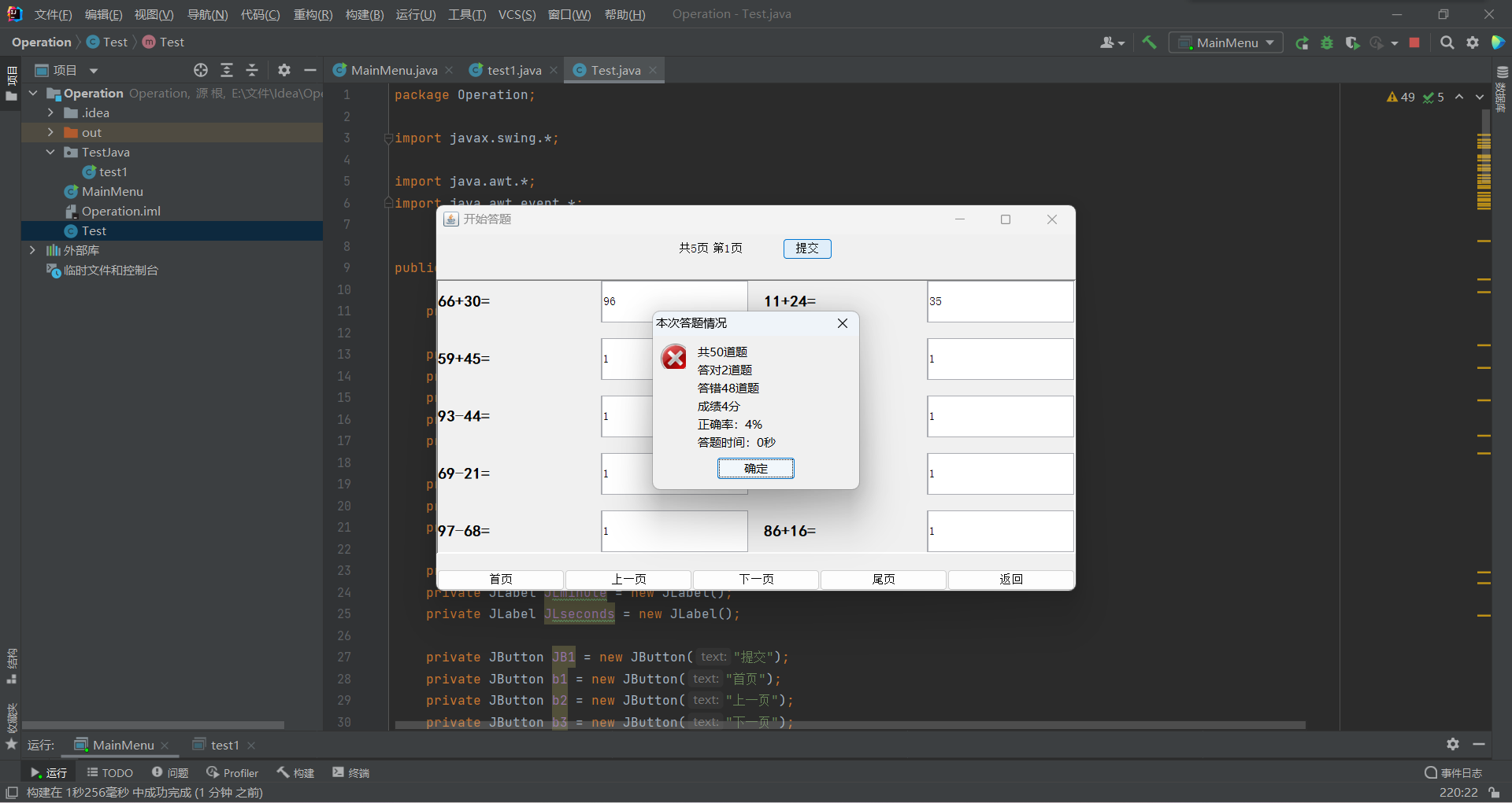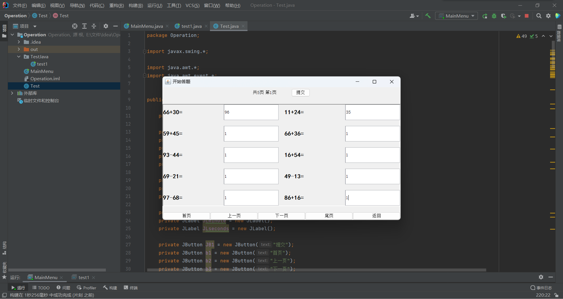 给之前的口算题生成软件构建合适的GUI界面(注意不能直接提交课程案例中的界面代码),并尝试到处exe可运行文件。提交实现效果截图及相关代码。
