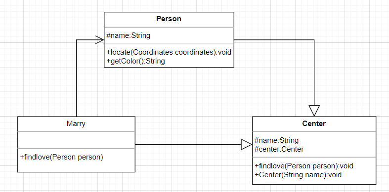 public abstract class Center { protected String name; public Center(String name){this.name=name;} public abstract void findlove(Person person); } public class Marry extends Center { public Marry(String name){super(name);} public void findlove(Person person) { if(person.getAge()<18) { System.out.println(name+":"+person.getName()+",对不起!不能早恋!"); } else if(person.getAge()<100) { System.out.println(name+":"+person.getName()+",我们会为您找到合适的伴侣!"); } else { System.out.println(name+":"+person.getName()+",对不起!您年龄太大了!"); } } } public class Person { protected String name; protected int age; public Person(String name,int age) { this.name=name; this.age=age; } public String getName() { return name; } public void setName(String name) { this.name = name; } public int getAge() { return age; } public void setAge(int age) { this.age = age; } } public class Client { public static void main(String args[]) { Center center1,center2; center1=new Marry("婚介"); center2=new Marry("婚介"); Person b1=new Person("喜羊羊",29); Person b2=new Person("美羊羊",16); center1.findlove(b1); center2.findlove(b2); } }