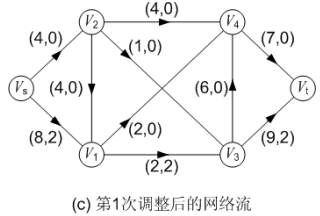 图(b)对初始流进行第一次标号,求得的增广路为: P( Vs, V2, V4, Vt ),可改进量α =1;调整后得到的网络流如图(c)所示,流量为 6。