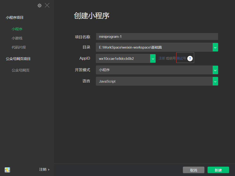 3.创建项目,初学时使用测试号