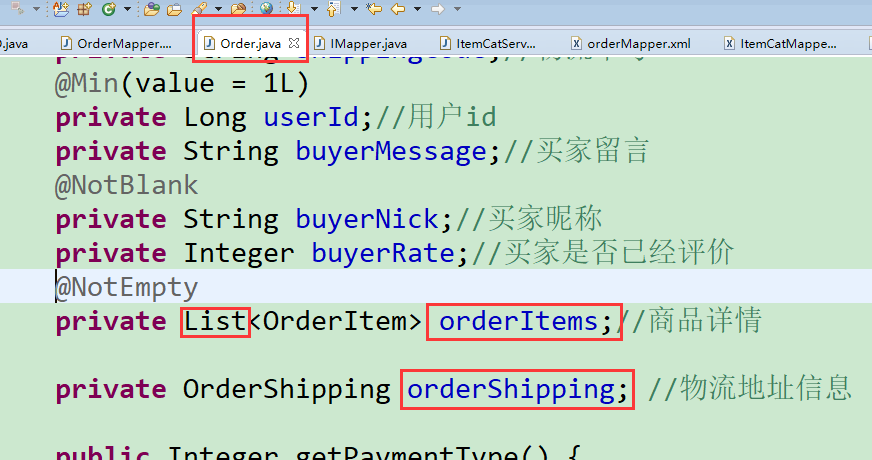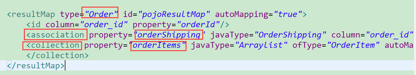 <resultMap type="Order" id="pojoResultMap" autoMapping="true"> <id column="order_id" property="orderId"/> <association property="orderShipping" javaType="OrderShipping" column="order_id" select="queryOrderShippingByOrderId" autoMapping="true"></association> <collection property="orderItems" javaType="Arraylist" ofType="OrderItem" autoMapping="true" select="queryOrderItemByOrderId" column="order_id"> </collection> </resultMap> <select id="queryOrderItemByOrderId" resultType="OrderItem" parameterType="String"> SELECT * FROM tb_order_item WHERE order_id = #{orderId}; </select> <select id="queryOrderShippingByOrderId" resultType="OrderShipping" parameterType="String"> SELECT * FROM tb_order_shipping WHERE order_id = #{orderId}; </select>