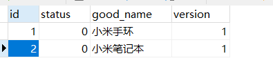 mysql> select * from t_goods; +----+--------+------+---------+ | id | status | name | num | +----+--------+------+---------+ | 1 | 1 | 手环 | 10 | | 2 | 2 | 鞋子 | 10 | +----+--------+------+---------+