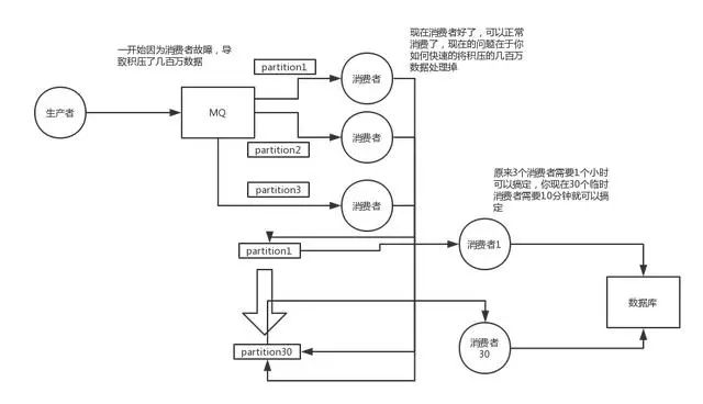 第2点有提到就是有些MQ的设计限制,导致的消费者数是没法动态拓展的,这个时候可以考虑将原先队列进行拆分,比如新建一个topic 分担一部分消息,这个方式需要对系统的上下游都要进行调整,在实际操作难度可能比较高,处理起来可能也比较耗时,如果在事前有做好这个设计那事发后就能很好进行调整
