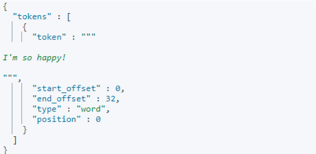 { "tokens" : [ { "token" : """ I'm so <b>happy</b>! """, "start_offset" : 0, "end_offset" : 32, "type" : "word", "position" : 0 } ] }