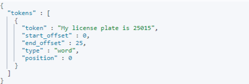 { "tokens" : [ { "token" : "My", "start_offset" : 0, "end_offset" : 2, "type" : "<ALPHANUM>", "position" : 0 }, { "token" : "credit", "start_offset" : 3, "end_offset" : 9, "type" : "<ALPHANUM>", "position" : 1 }, { "token" : "card", "start_offset" : 10, "end_offset" : 14, "type" : "<ALPHANUM>", "position" : 2 }, { "token" : "is", "start_offset" : 15, "end_offset" : 17, "type" : "<ALPHANUM>", "position" : 3 }, { "token" : "123_456_789", "start_offset" : 18, "end_offset" : 29, "type" : "<NUM>", "position" : 4 } ] }