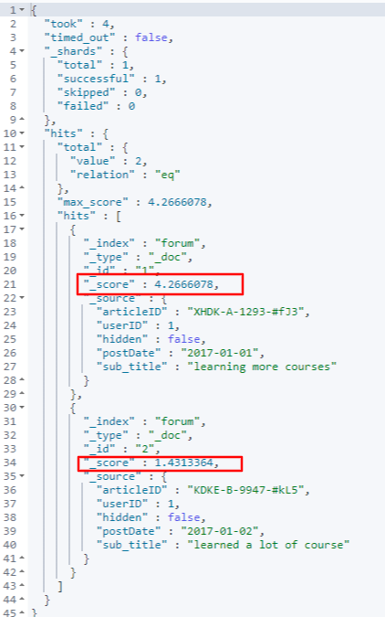 GET /forum/_search { "query":{ "match":{ "sub_title": "learning courses" } } }