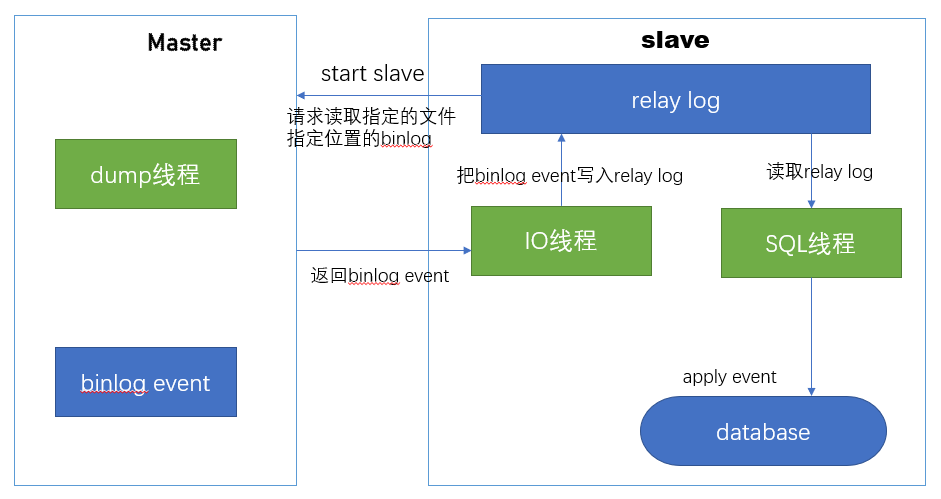 start slave命令之后,从节点会创建一个I/O线程用来连接主节点,请求主库中更新的bin-log。I/O线程接收到主节点binlog dump 进程发来的更新之后,保存在本地relay-log中。 - 从节点(SQL tread): SQL线程负责读取relay log中的内容,解析成具体的操作并执行,最终保证主从数据的一致性