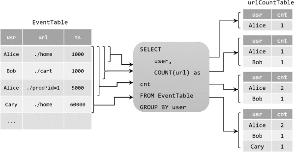 Table urlCountTable = tableEnv.sqlQuery(“SELECT user, COUNT(url) as cnt FROM EventTable GROUP BY user”);