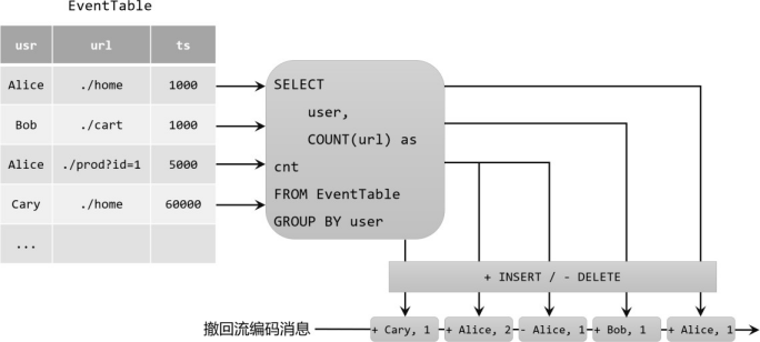用+代表 add 消息(对应插入 INSERT 操作),用-代表 retract 消息(对应删除 DELETE 操作);当 Alice 的第一个点击事件到来时,结果表新增一条数据[Alice, 1];而当 Alice 的第二个点击事件到来时,结果表会将[Alice, 1]更新为[Alice, 2],对应的编码就是删除[Alice, 1]、插入[Alice, 2]。这样当一个外部系统收到这样的两条消息时,就知道是要对Alice 的点击统计次数进行更新了。