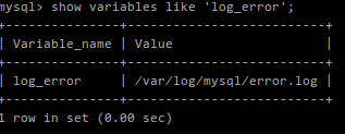该日志对数据库实例的启动、运行和关闭都会进行记录,虽然说是错误日志,但也会记录一些警告或者一般的提示信息,比如启动信息和关闭信息,所以当数据库启动或者关闭出问题时,首先要看这个日志文件,关于日志文件的位置可以通过查询mysql变量的方式来获得,如下: