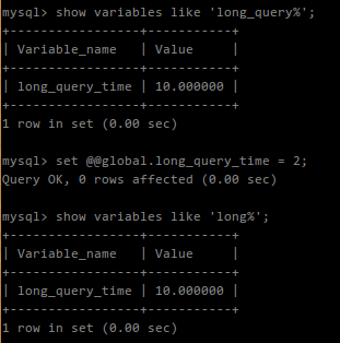 此处的解决办法是重开一个会话,才会看到已经修改的long_query_time参数。