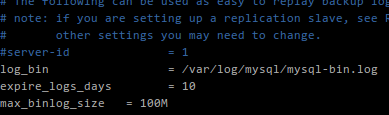 默认情况下并没有开启二进制日志,需要手动启动,通过配置参数log-bin[=name]启动二进制日志,该参数是静态参数,也就是在整个服务运行期间,该参数是只读的不能修改,所以在配置文件中修改完配置需要重启服务才能生效,不指定name,默认情况下日志文件名为主机名,后缀名是二进制日志的序号,该文件保存在数据库目录中,与datadir相同,在开启二进制后还会产生一个与二进制文件名相同但是后缀名是index的文件,该文件是二进制的索引文件,其中存储的是二进制日志的序列号,修改如下: