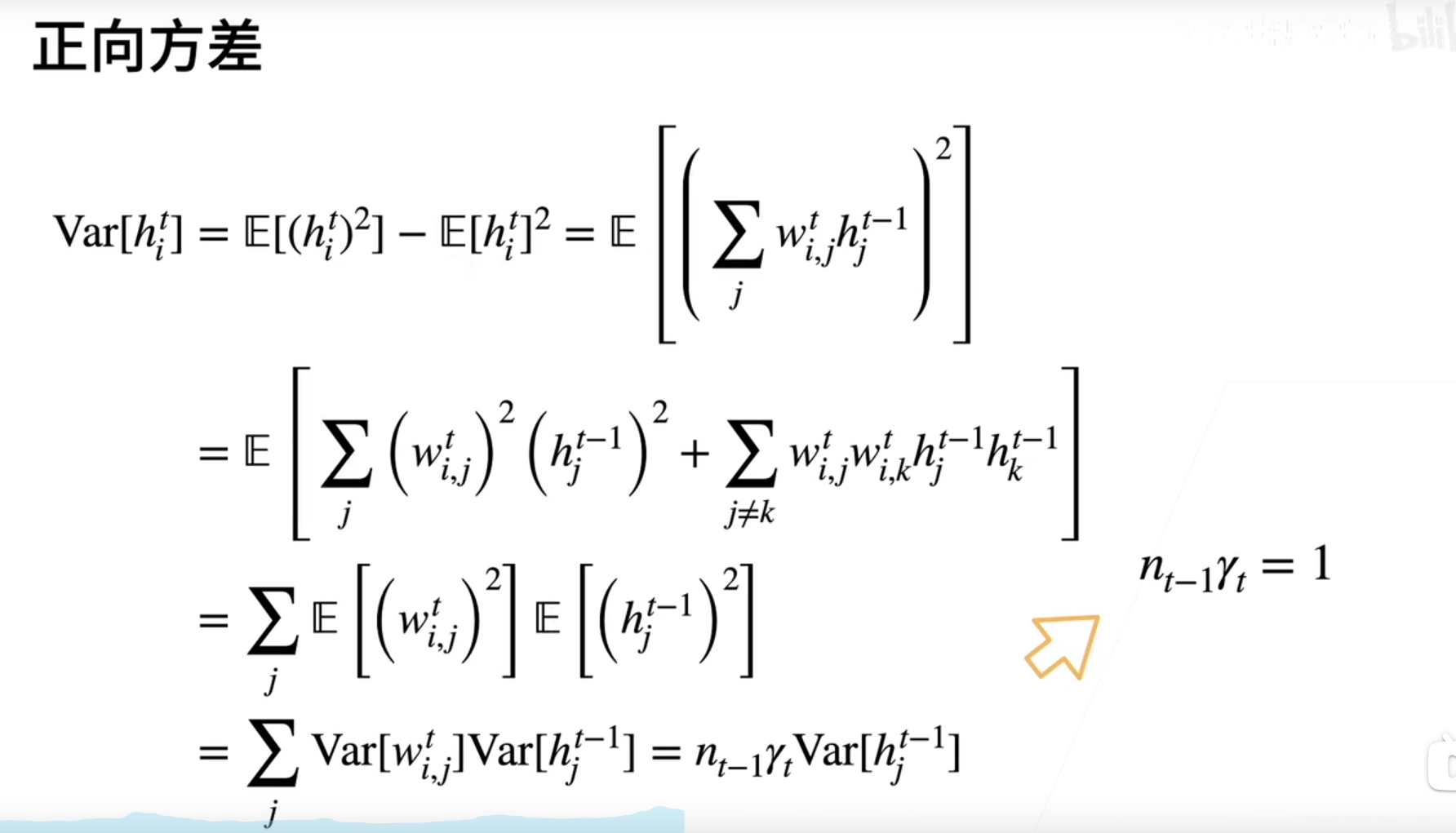 这里将E均值换成了Var方差,是因为二者的均值都为0,所以计算方差的时候第二项都为0,那么方差自然就和样本平方的均值相等了,但是……hjt-1的均值=0是什么时候说的?难道说是因为认为只要不是第一层,它都等于0,因为每层都乘以了均值为0的权重矩阵?(喵喵不解)
