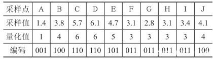 我们将采样得到的实数信号值通过一定的近似方法(这里采用“四舍五入到整数”的近似方法)转化为量化值(量化值本身可以是整数或者实数),然后再将量化值对应到3位二进制数,称为编码,这样我们就能在电脑中存储这一段信号了。