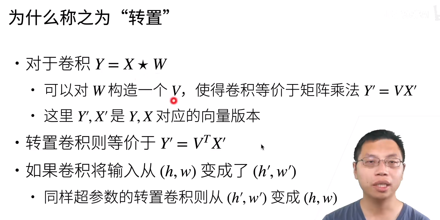 早期的卷积都是通过这种等价的矩阵乘法完成的,从这个角度看,我们用来卷积的卷积核对应的向量为V,而反过来的卷积正好是V的转置,因此这种反卷的过程叫做转置卷积。