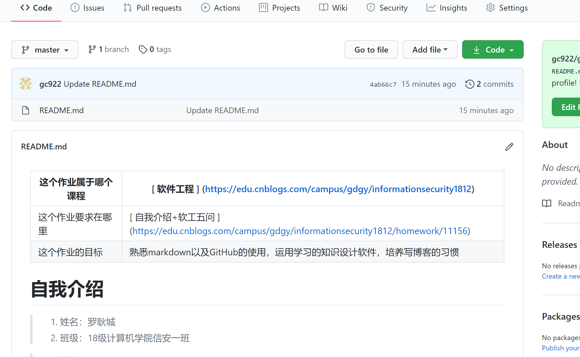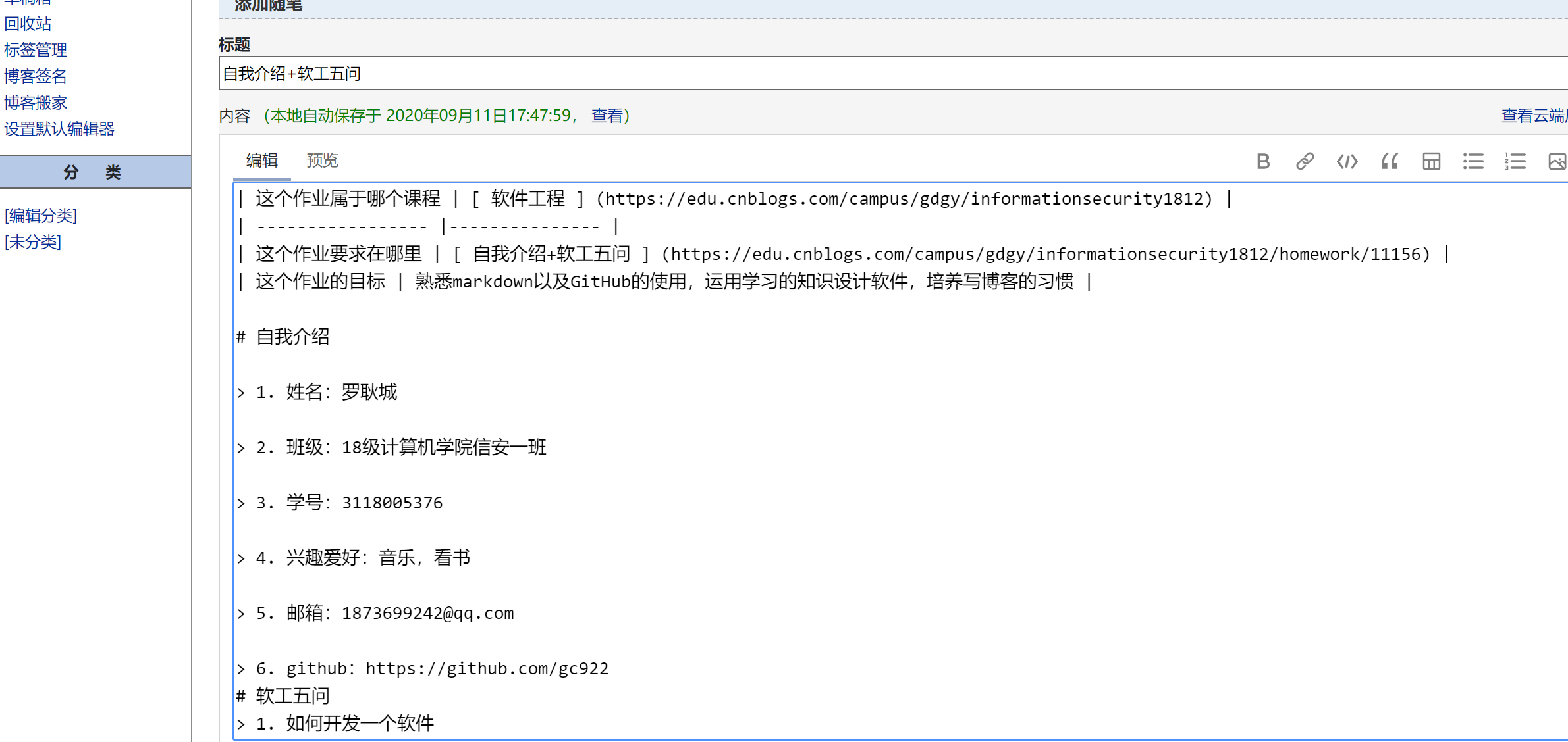 | 这个作业要求在哪里 | [ 自我介绍+软工五问 ] (https://edu.cnblogs.com/campus/gdgy/informationsecurity1812/homework/11156) |