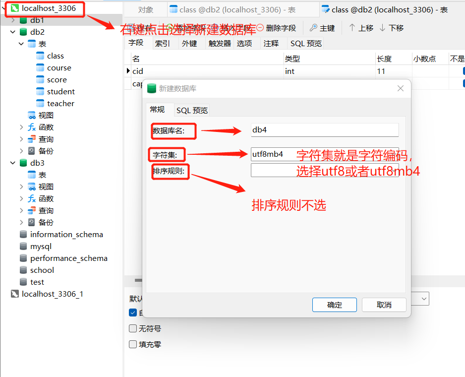 建数据库:右键点击我们连接好的localhost_3306>>>选择新建数据库>>>写上数据库名,字符集(字符编码)写utf8或者utf8mb4(功能更多,支持表情),排序规则不用选择>>>点击确定