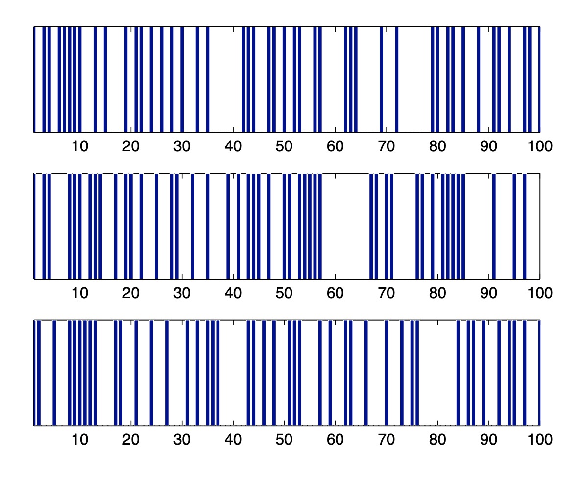 图 1.1:三个实验,每个实验一枚的硬币被抛掷 100 次。黑条表示“正面”(=1) 出现。