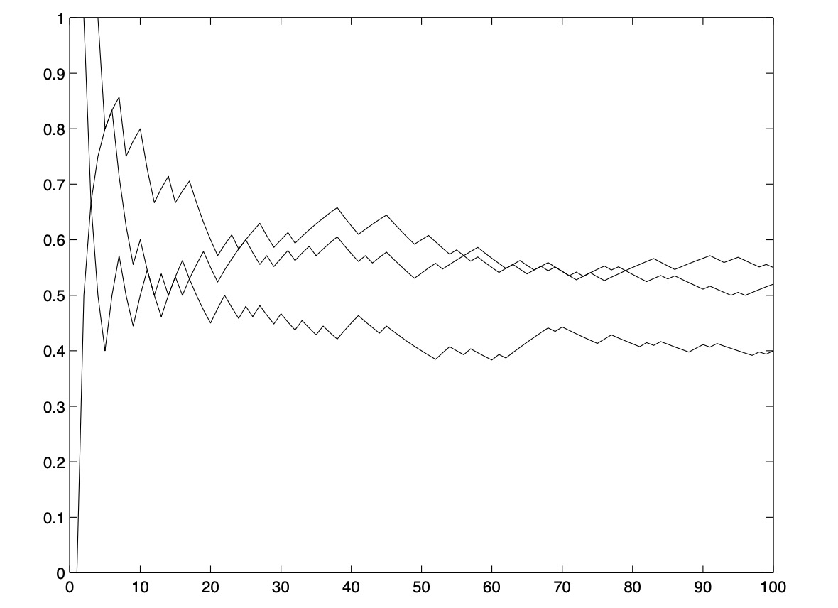 三次实验的结果如图 1.2 所示。请注意,抛出正面的平均次数看起来收敛于 1/2,但存在大量随机波动。