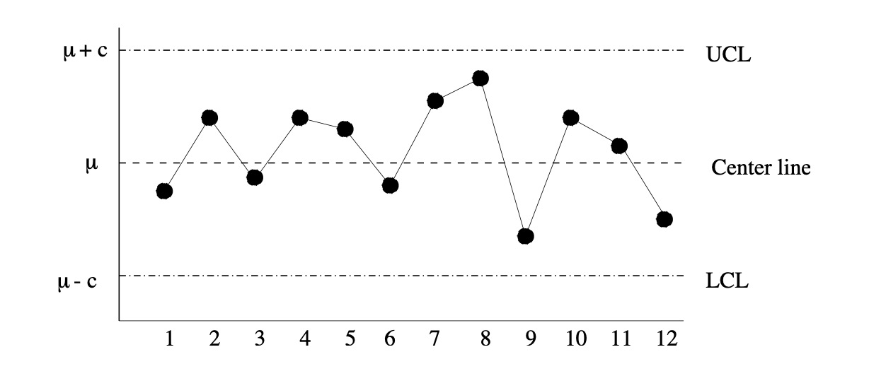 示例 1.2(控制图 Control Chart) 控制图(见图 1.3)通常在制造业中作为一种质量控制手段。测量产品的每小时平均产量(例如 10 袋糖的平均重量),以评估产品是否仍然“受控”,例如机器是否平均将正确数量的糖放置在袋子里。当产品 > 控制上限或 < 控制下限时,会发出产品失控的警报,例如,需要调整机器,因为它在袋子中放入的糖过多或不足。问题是如何设置控制范围,因为随机过程自然会围绕其“中心”或“目标”线波动。