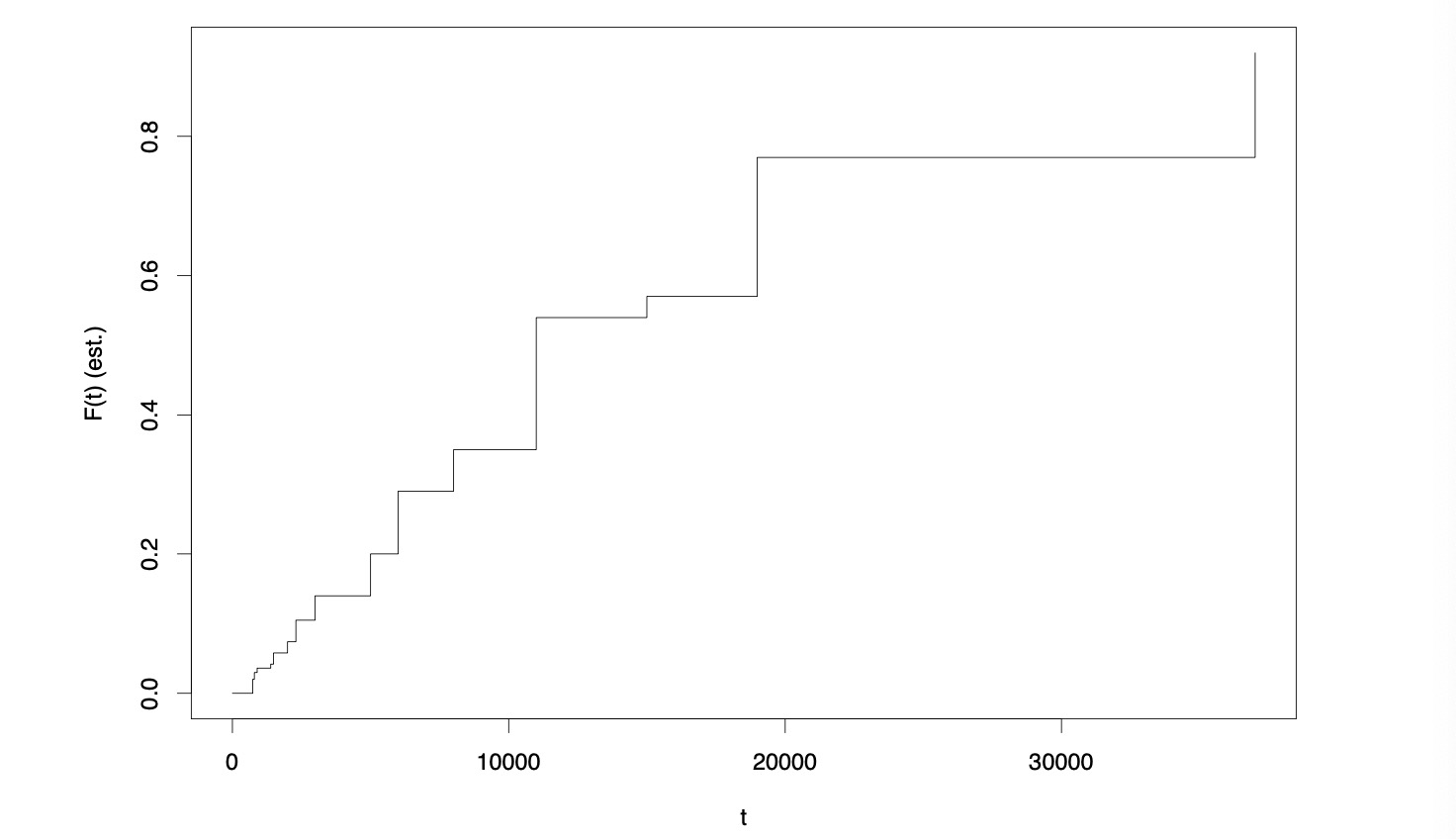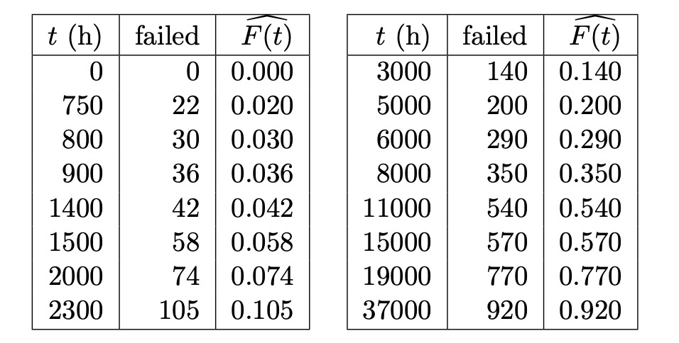 示例 1.3(机器寿命) 假设对 1000 个相同组件进行长达 50,000 小时的故障监控。这种随机实验的结果通常总结为累积寿命表图,分别如表 1.1 和图 1.3 所示。这里 Fˆ(t) 表示在时间 t 失效的组件的比例。一个问题是如何通过连续函数 F 来建模 Fˆ(t) ,以表示一个典型组件的寿命分布。