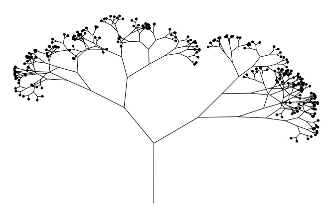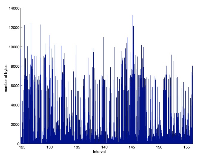 下面是另外两张随机性的图片。第一个是计算机生成的“植物”,它看起来非常像真正的植物。第二个是真实数据,描述了某些通信链路传输的字节数。一个有趣的特征是,数据可以表现出“分形(fractal)”行为,也就是说,如果将数据统计(aggregated)为更小或更大的时间间隔,就会出现类似的图片。