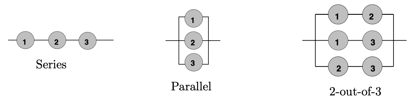 示例 1.7(系统可靠性) 图 1.9 描述了三个系统,每个系统由 3 个不可靠的组件组成。串型(series)系统当且仅当所有组件都工作时才工作;并型(parallel)系统当且仅当至少一个组件工作就会工作;2-out-of-3 系统当且仅当 3 个组件中的 2 个可以工作则可以工作。