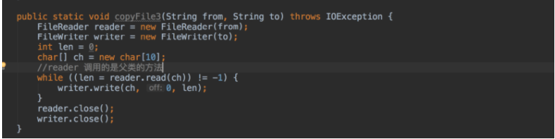 public static void copyFilePathName(String fromSrc,String toSrc) {//fromsrc 要复制的文件位置 toSrc 目标文件位置 FileInputStream inputStream=null;//输入流 FileOutputStream outputStream=null;//输出流 try { inputStream=new FileInputStream(fromSrc); outputStream=new FileOutputStream(toSrc); int len=0;//指向文件开头 byte[] data =new byte[20]; //一边读文件,一边写文件 while ((len=inputStream.read(data))!=-1) { outputStream.write(data,0,len); } } catch (FileNotFoundException e) { e.printStackTrace(); } catch (IOException e) { e.printStackTrace(); }finally {