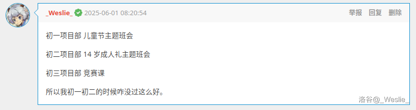晚上六点我看到了 lg 讨论区倒闭的消息。确实挺吃惊的,不过我觉得这对后来的 OIer 或许有好处吧。当时爱水灌水把我害惨了。\(2024\) 年后半年基本就没看过灌水区,暑假的时候灌水区全是机房惨案,还有好几个我爱你峮峮,真的快把我整无语了。所以把灌水区关了是好事。