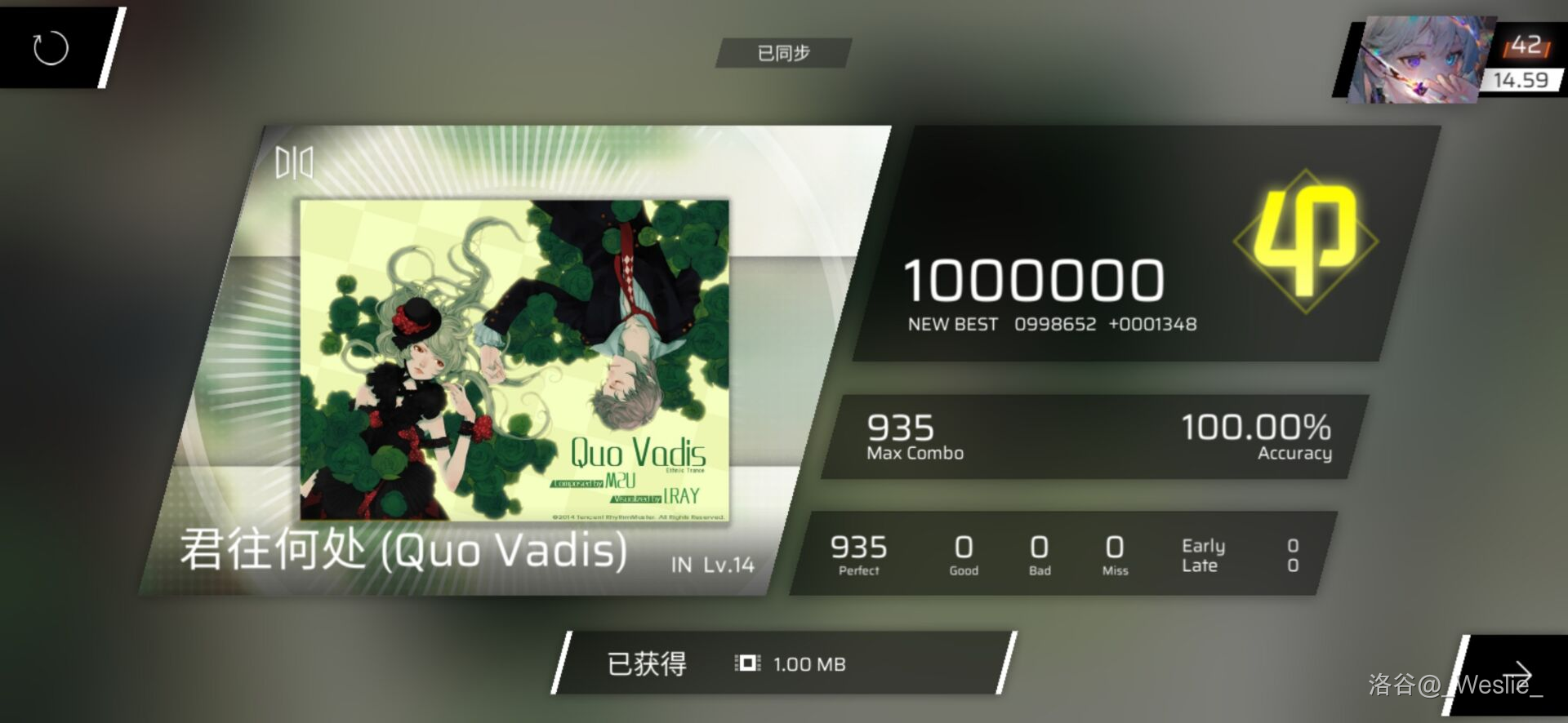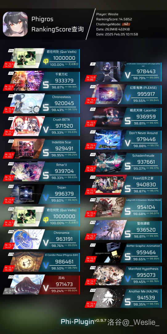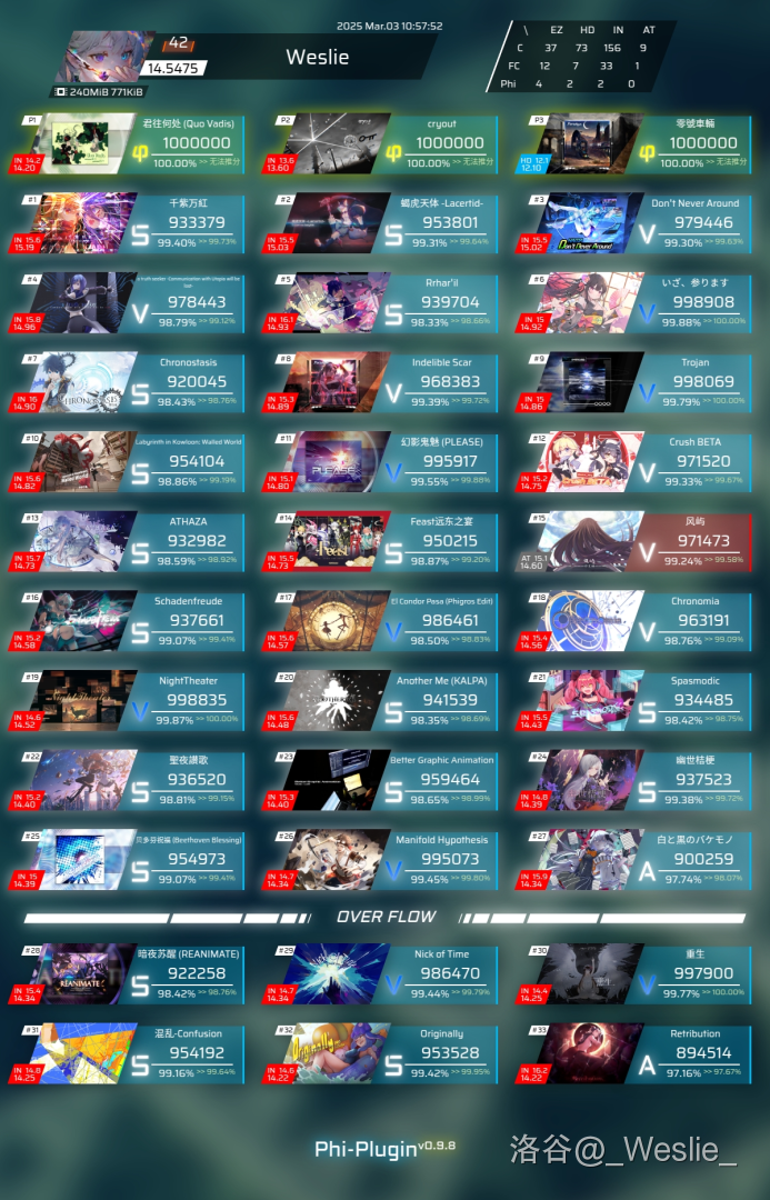 初见 \(61w\),二见 \(67w\),我看着我 \(14.63\) 的 rks 陷入了沉思。我们班有个 \(14.2\) 的同学初见都比我高(虽然愚人节铺这么低的分比较的意义不大就是了)。