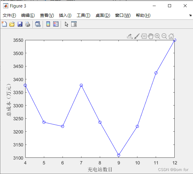 xlabel('充电站数目');ylabel('总成本(万元)');