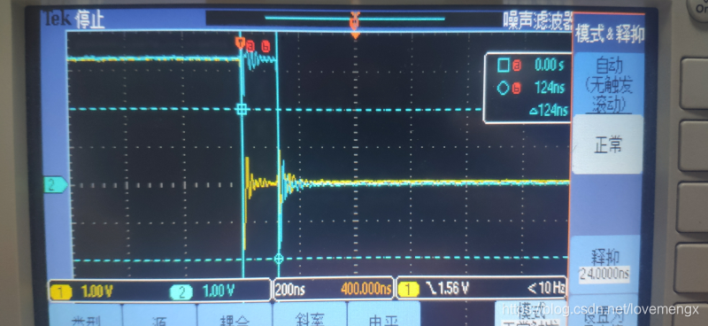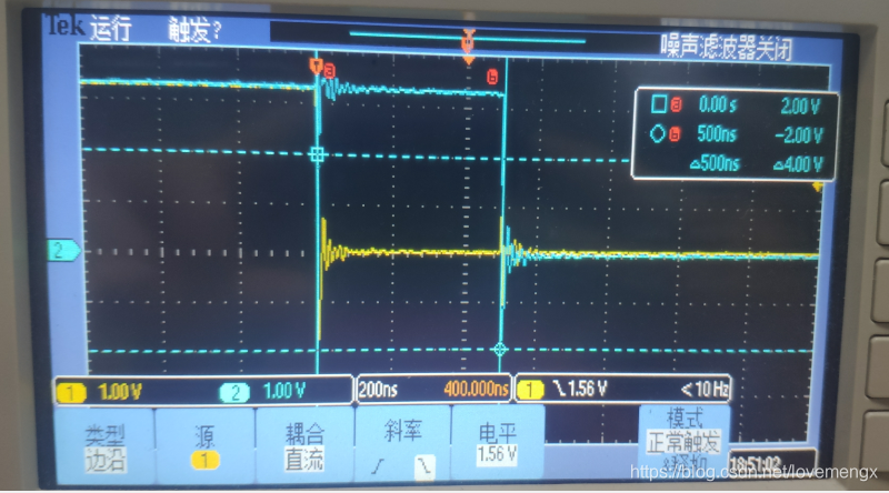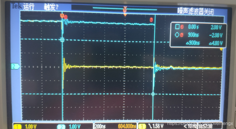 发现有一颗还存在 60uA 电流,查看原理图发现该芯片的 FI\BI 控制脚分别在GPIOA和GPIOB组,测得波形如下(500ns):
