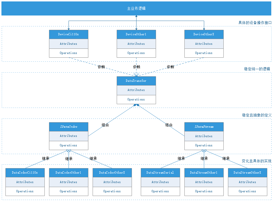 这样,主业务逻辑代码无论应对什么外设,都可以完全的复用代码,根据实际场景随意组合 DataStream 和 DataCodec。并且新增的外设,只需要实现 IDataCodec 定义的接口,即可完成数据包编解码部分,若是新增的通信接口,也可按照 IDataStream 定义的接口实现即可。如新增一个 XXXA 设备,设备自有通信协议,使用 Serial 通信接口,那么只需要按照 IDataCodec 定义的接口,实现 XXXA 的通信协议,通信接口复用现有的 DataStreamSerial,即可完成数据通信。