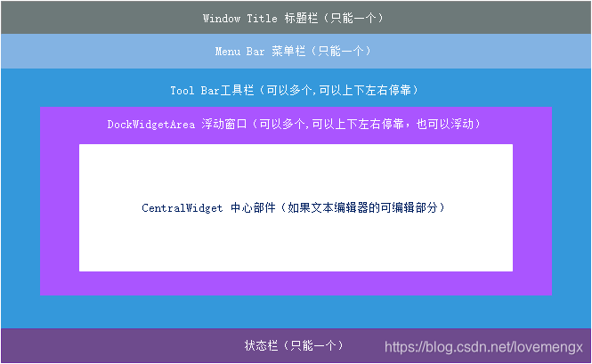 QMainWindow 是一个为用户提供主窗口程序的类,包含以下几种类型部件,是许多应用程序的基础。