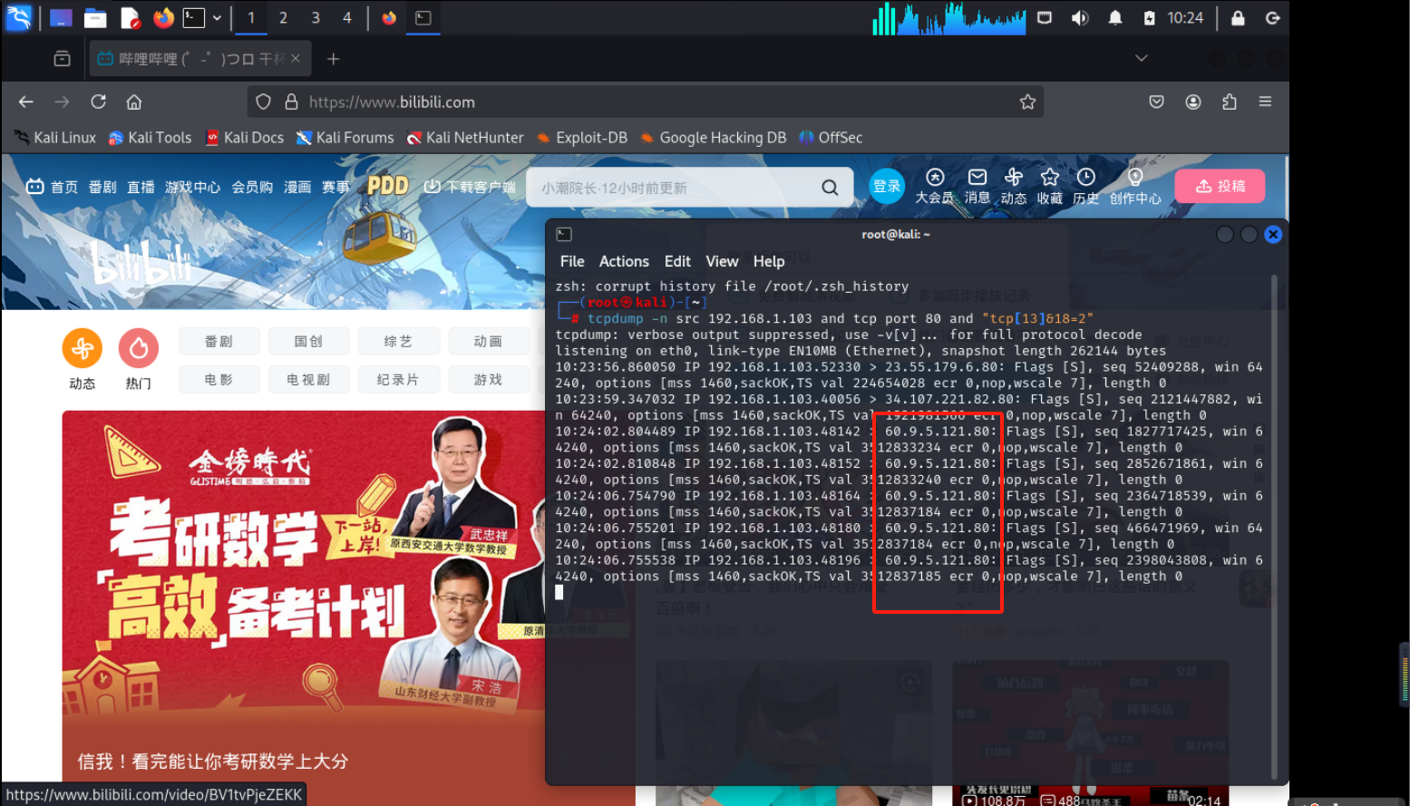 在终端输入命令tcpdump -n src 192.168.1.103 and tcp port 80 and "tcp[13]&18=2",打开firefox访问www.bilibili.com(tianya.cn无法访问):