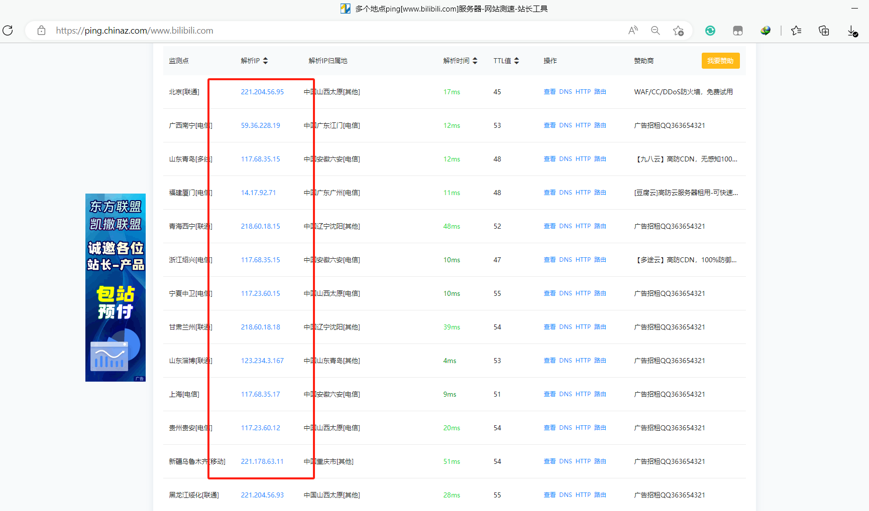 可见其ip为60.9.5.121,但查询其dns记录,和这一IP地址不相同,怀疑采用了cdn加速,使用超级ping验证,证实有cdn加速: